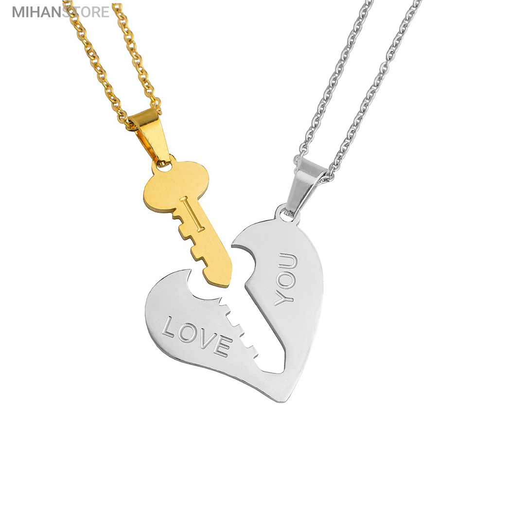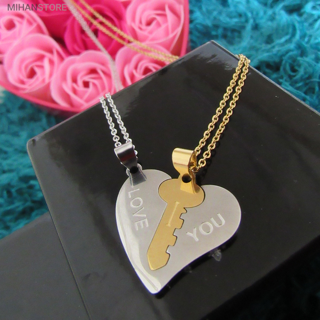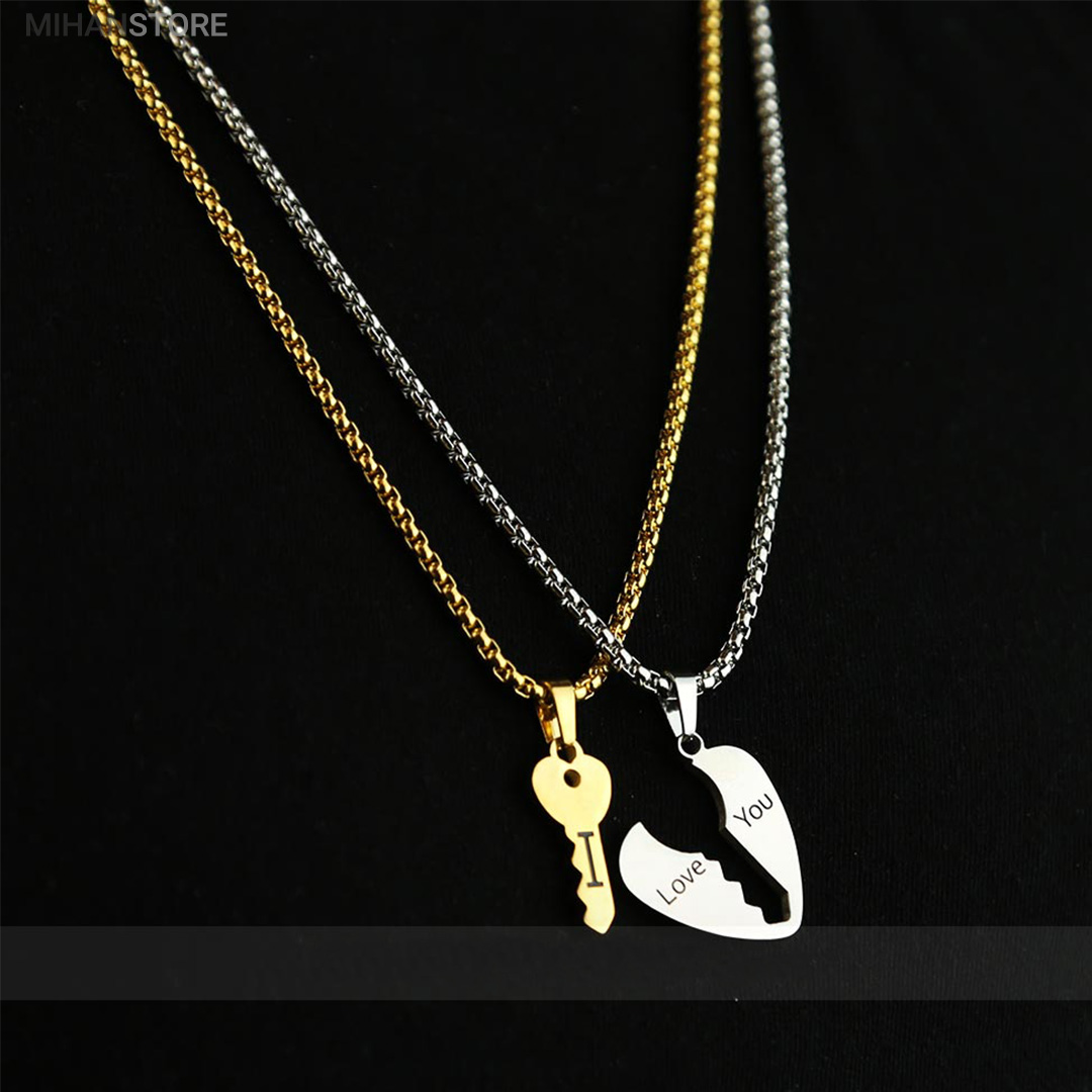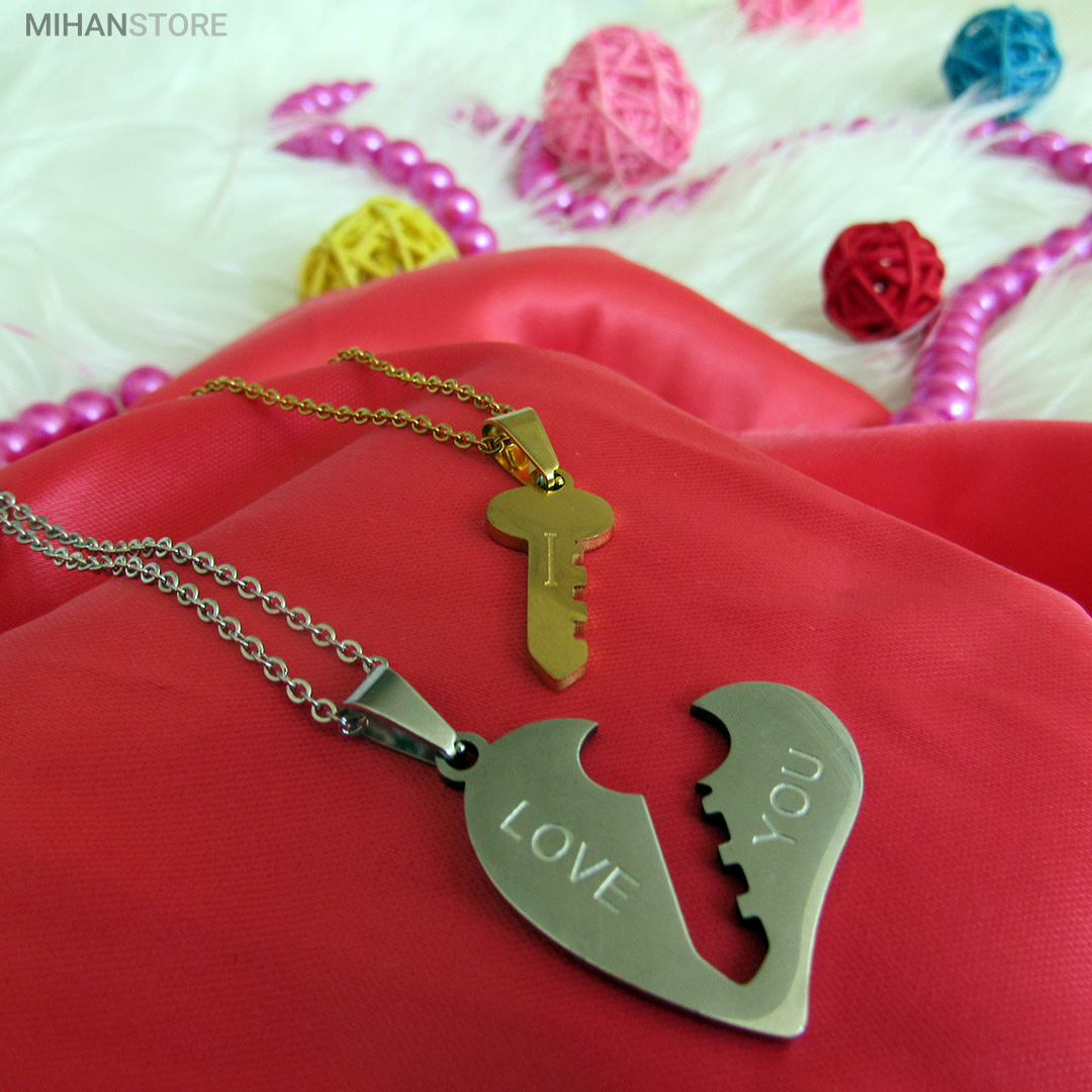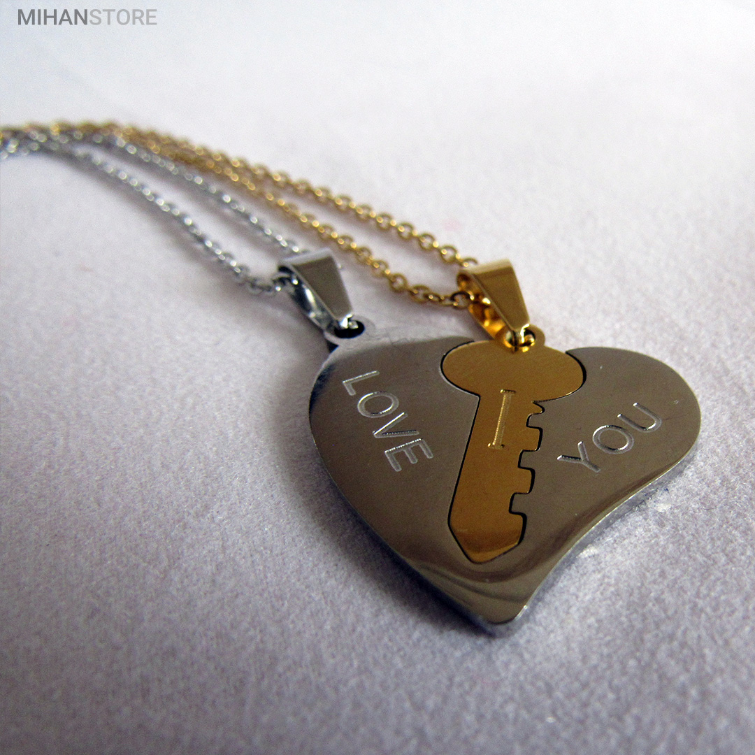 گردنبند دو تکه قلب و کلید استیل رنگ ثابت و ضد حساسیت که از یک پلاک قلب نقره ای و یک پلاک کلید طلایی تشکیل شده است و می تواند هدیه ای زیبا برای روز تولد و روز ولینتاین و… باشد. این مجموعه گردنبند زنانه و مردانه از جنس استیل Stainless Steel بوده و کلمه ی I LOVE YOY به معنای "دوستت دارم" با زیبایی و ظرافت بر روی آن ها حک شده است. این زیور به دلیل ابعاد ظریف و طراحی ساده و زیبایی که دارد براحتی مورد قبول سلیقه های خاص قرار میگیرد. گردنبند زنانه ی این مجموعه قلبی شکل کوچک با ابعاد 30 میلی متر است که قلب به رنگ نقره ای و کلید به رنگ طلایی است. طول زنجیر این آویز 44 سانتی متر است. استفاده از مواد اولیه ی با کیفیت، ظرافت در طراحی و همچنین استفاده از واژه ی "دوستت دارم" این مجموعه را به انتخاب مناسبی برای عشاقی که می خواهند یادگاری ای برای عشق جاودانه ی خود داشته باشند، تبدیل کرده است. همچنین زیبایی و خاص بودن این محصول یک هدیه ی مناسب و جالب برای سالگرد ازدواج و یا هر مناسبت مشابه دیگر میباشد.