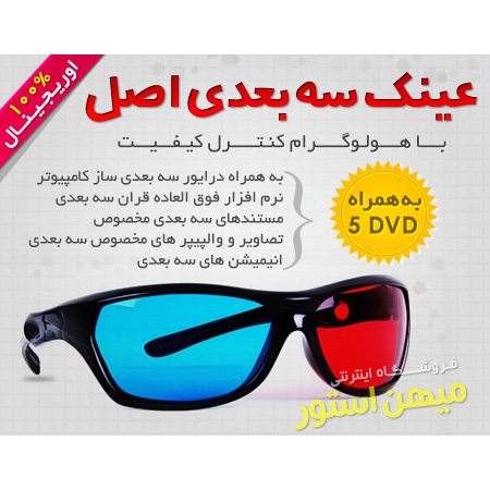 اگر هيجان را دوست داريد! اگر دوست داريد فيلم هاي سه بعدي ببينيد! اگر دوست داريد بازي هاي سه بعدي انجام دهيد! پکیج اورجینال عینک سه بعدی دارای هولوگرام کنترل کیفیت QC همراه با 5 DVD شامل درایور سه بعدی ساز کامپیوتر و مجموعه ای از تصاویر، کلیپ، انیمشین، مستند و بازی های سه بعدی برای اولین بار در ایران با قیمتی استثنایی توسط فروشگاه میهن استور عرضه شده است. این مجموعه در تمام کامپیوتر ها و رایانه های همراه (لپ تاپ) قابل استفاده می باشد.